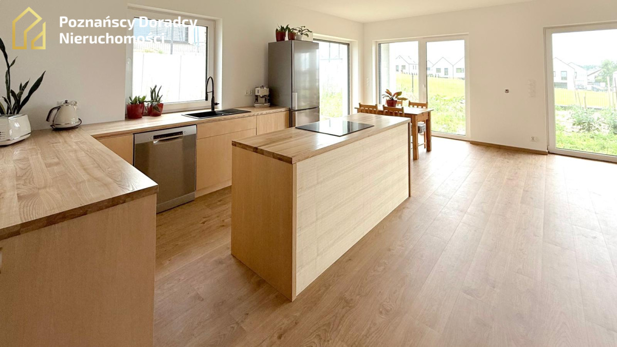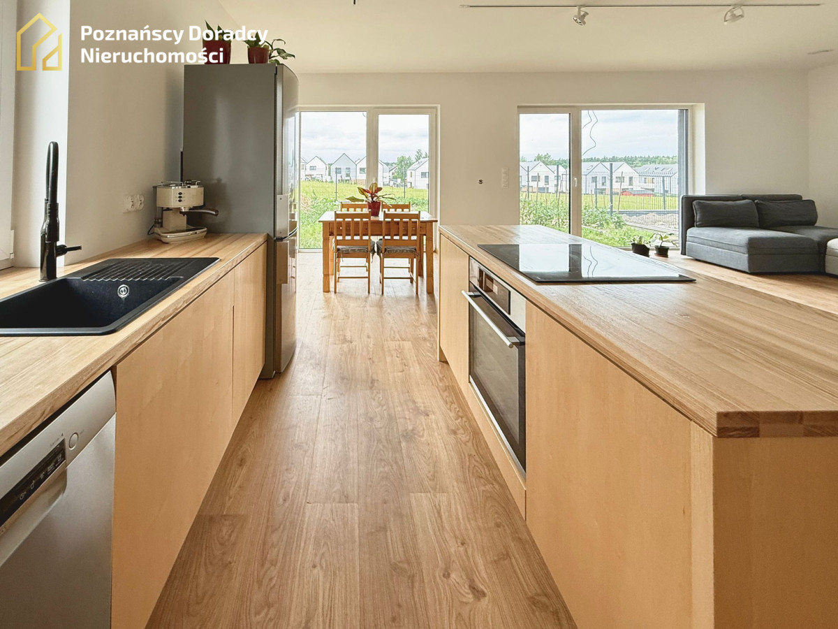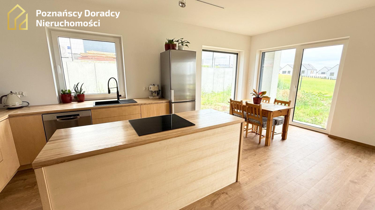 W kuchni znajdziesz funkcjonalną zabudowę z wyspą, piekarnikiem, płytą indukcyjną oraz dużym zlewem z widokiem na ogród.
