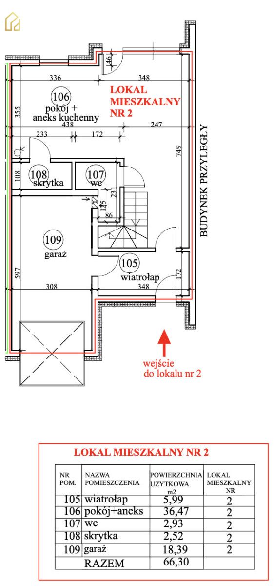 Do każdego z lokali przynależy miejsce postojowe przed budynkiem oraz garaż w bryle budynku.