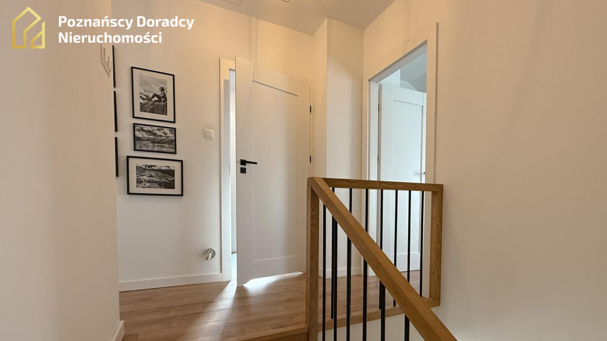 Na piętro prowadzą wykonane z drewna jesionowego schody. Znajdują się tu trzy duże, ustawne pokoje o powierzchni ok. 12 m² każdy oraz przestronna łazienka o powierzchni ok. 8 m².