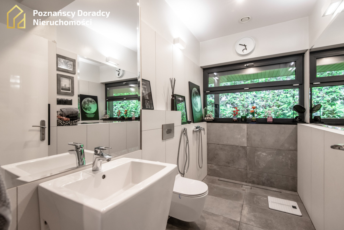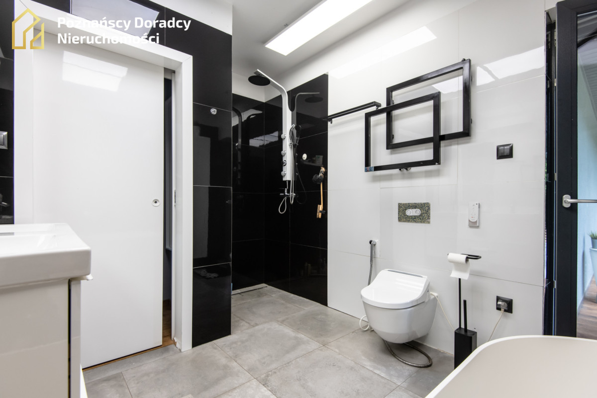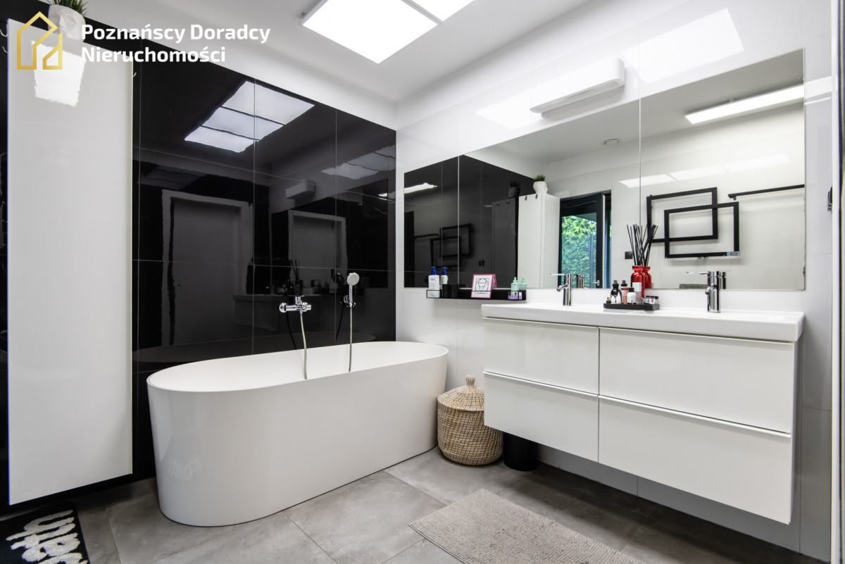 - Łazienka: Rodzinna łazienka z nowoczesnym wyposażeniem, designerską wanną oraz prysznicem.