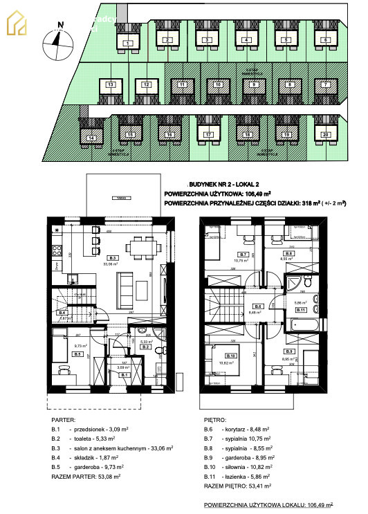 Domy wyposażone są w media: woda, prąd, kanalizacja, światłowód. Każdy z domów posiada udział w drodze wewnętrznej.