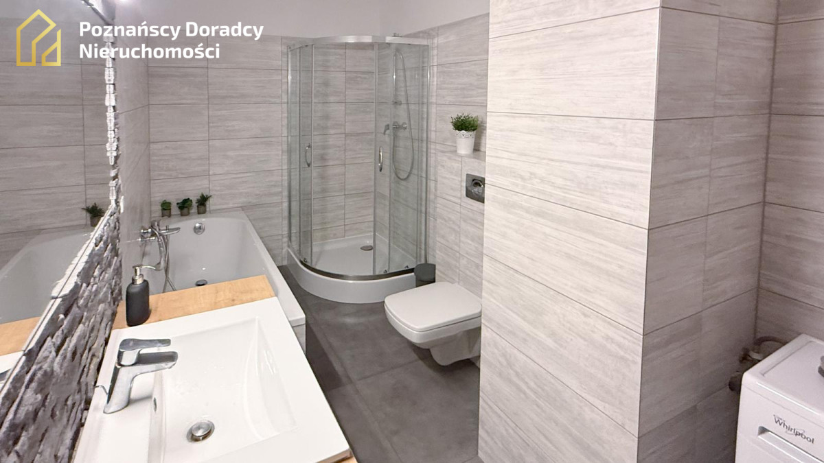 - łazienka (~ 6,5 m²) z wanną, prysznicem i pralką,